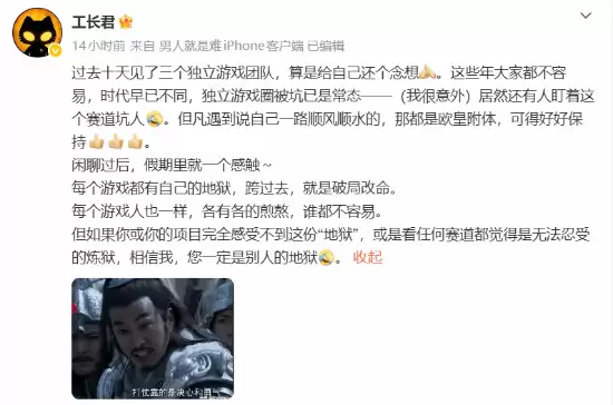 结合这几场深度访谈,工长君总结了他的核心观察。他指出,每一个游戏研发项目几乎都有其专属的“难关”或“地狱时刻”——可能是棘手的技术实现难题,可能是持续的资金链压力,也可能是创作过程中的灵感瓶颈。而项目能否成功破局,其关键恰恰在于团队是否具备咬牙坚持、跨越这片专属困境的决心与能力,从而实现命运的转折。