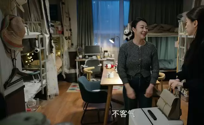 即便道具摆放意在表现杂乱,但所有物品都缺乏使用痕迹,空间通透宽敞,中间甚至摆着大桌和设计感椅子,两边过道通行无阻。现实中,哪家酒店的员工宿舍能有这般条件?