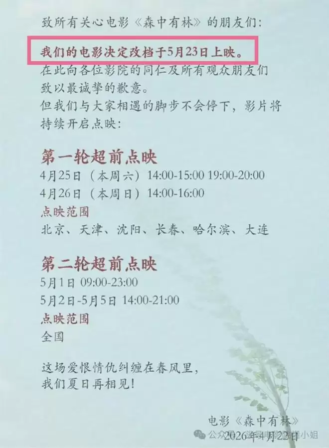 就在这预售遇冷的背景下,4月22日,《森中有林》官宣改档,从原定的5月1日挪到了5月23日。