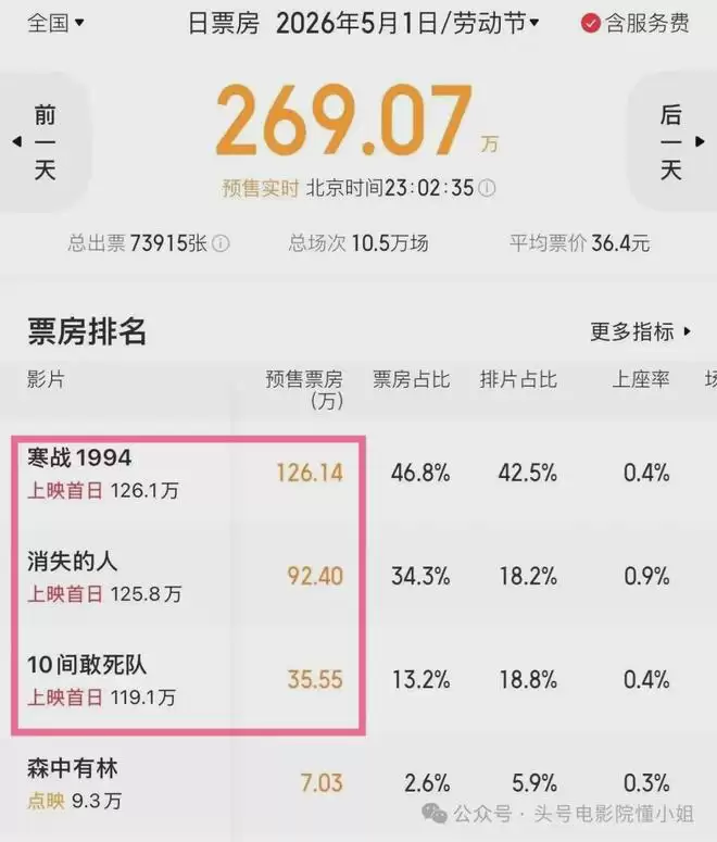 回顾往年:2024年五一档票房16.73亿,2024年五一档票房15.21亿,2024年五一档票房15.28亿。而今年,业内最乐观的预测,总票房也难以超过15亿。