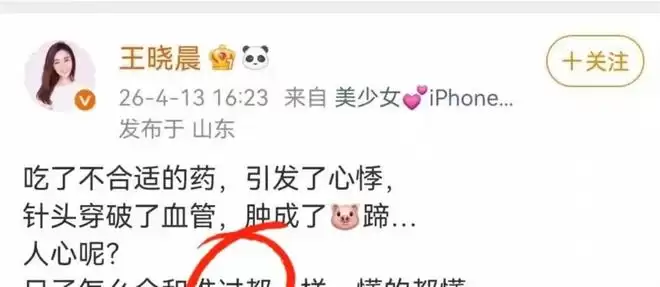 事件发生于2026年4月13日下午。王晓晨在个人社交账号上发布了在急诊室拍摄的照片,并说明自己因服药不当引发了心悸症状。照片里,因输液渗漏而肿胀的手臂状况,确实令粉丝和网友感到心疼。