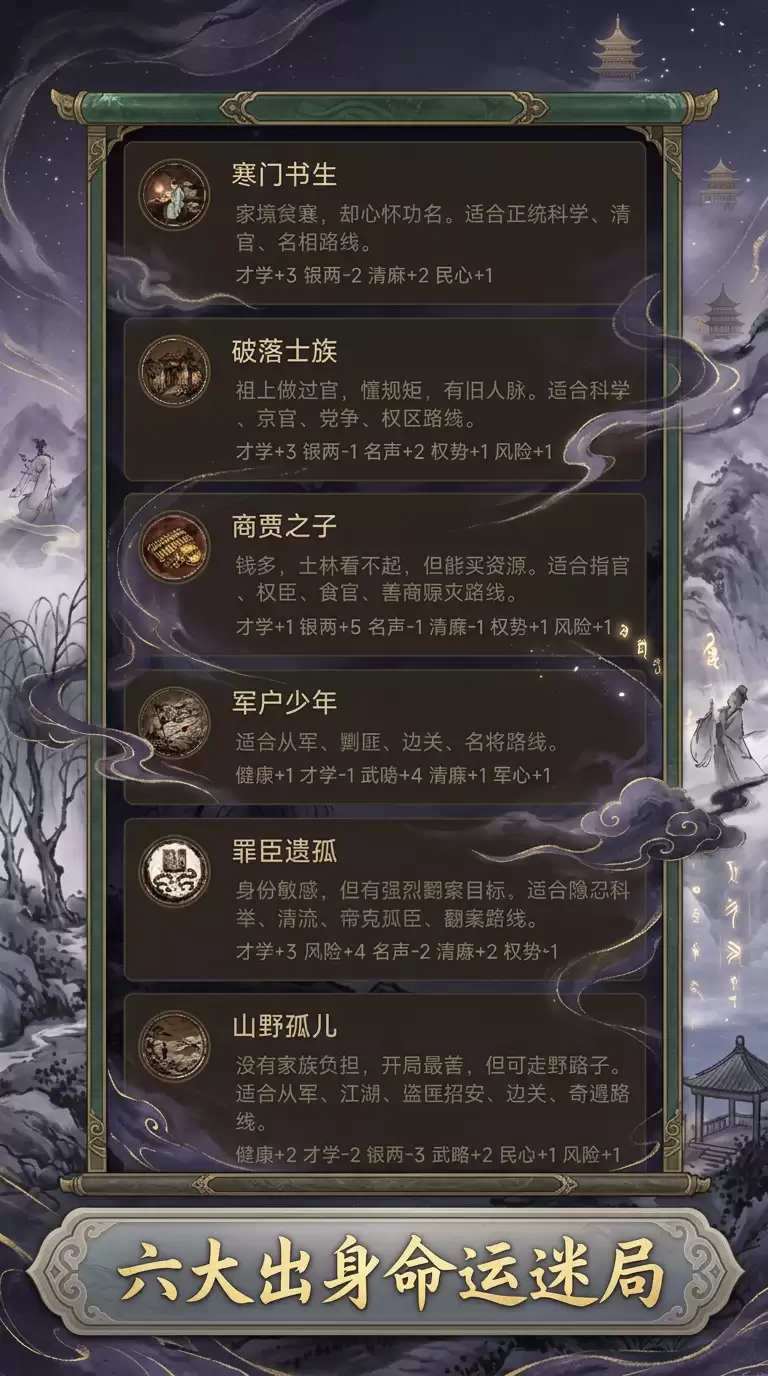 《古梦浮生》是一款深度沉浸的古代人生模拟文字游戏。游戏伊始,你将从六个截然不同的出身中选定人生起点:是寒窗苦读的寒门书生,是力图重振家声的破落士族,是精于算计的商贾之子,是渴望建功的军户少年,是背负枷锁的罪臣遗孤,抑或是了无牵挂的山野孤儿。你的每一个抉择,都将深刻影响才学、武略、银两、名声、权势等十大核心属性,从而在科举仕途、沙场征战与朝堂权谋的洪流中,推动命运驶向未知的彼岸。