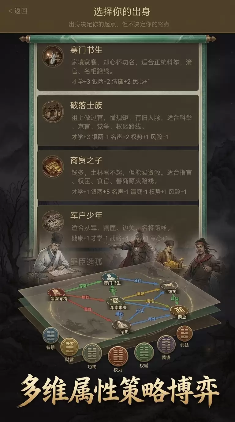 游戏贯穿少年、中年、晚年三大人生阶段,其间穿插数十种随机事件与关键抉择。最终,数十个迥然不同的人生结局等待揭晓——你会成为流芳百世的清廉名相、威震四方的铁血名将、富甲一方的豪商,还是不幸沦为阶下之囚?命运的笔,始终握在你的手中。