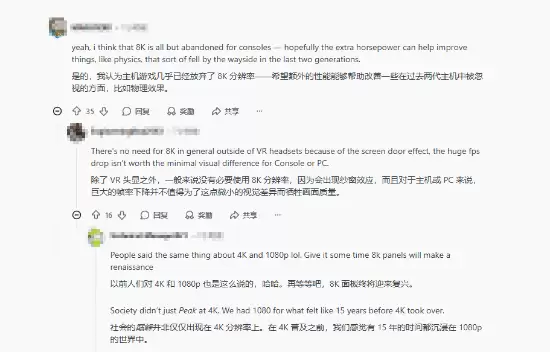在玩家社群中,“放弃8K,专注体验优化”的设想获得了广泛认同。许多玩家指出,主机厂商已用实际行动表明对不切实际的8K目标的淡化,更希望将节省的性能资源用于改善游戏的实际体验,例如更真实的物理破坏系统、更丰富的环境互动元素以及更稳定的高帧率模式。有玩家明确表示:在主流尺寸的显示设备上,为了几乎无法感知的8K画质提升而牺牲帧率与流畅度,并不值得。当然,也有声音提醒,正如当年从1080P到4K的过渡曾受质疑一样,8K的未来潜力仍不应被完全否定。