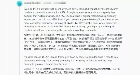 事实上,分辨率的实际价值与屏幕尺寸、观看距离紧密相关。在常规客厅观看距离下,8K相比4K的视觉差异微乎其微。数据同样佐证了这一趋势:Steam硬件调查显示,至今使用4K分辨率的PC玩家占比仍不足5%。高分辨率对硬件性能的要求极为严苛,因此许多玩家更倾向于在2K分辨率下享受120Hz以上的高刷新率体验,其流畅性与操控响应远胜于在4K下勉强维持60帧。这也正是DLSS、FSR等超分辨率技术迅速普及的关键——它们通过智能算法在保持画质观感的同时,显著降低了硬件负载。