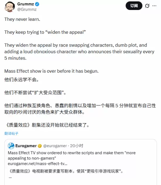 消息一出,立刻在核心玩家社群中引发了强烈反响。知名游戏业内人士Grummz的评论颇具代表性:“他们永远学不会。所谓的‘扩大受众范围’,往往成了种族互换角色、添加愚蠢剧情,或是塞进一个每隔五分钟就要强调自己性取向的吵闹角色的借口。照这个趋势,《质量效应》剧集还没开拍,就已经结束了。”