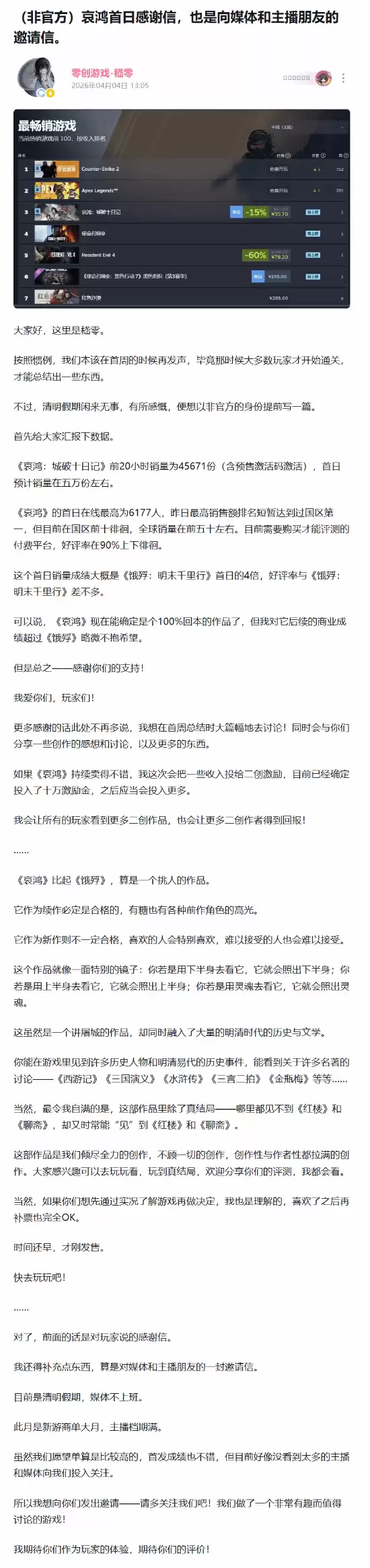 更为直观的对比来自于其前作数据。官方明确表示,《哀鸿:城破十日记》的首日销量成绩,已达到前作《饿殍:明末千里行》同期数据的约4倍,而两款作品的好评率却基本持平。这意味著什么?用官方既兴奋又务实的话来总结:“可以确定,《哀鸿》已经是一款100%收回成本的作品。” 话语虽直白,但对于开发团队与发行方而言,没有比这更坚实、更令人振奋的市场肯定了。