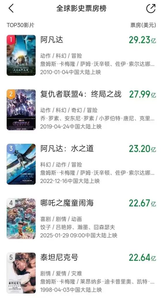 放眼全球影史票房榜,目前的格局可谓巨头云集。排在《哪吒2》之前的,分别是2010年的《阿凡达》(近30亿美元)、2019年的《复仇者联盟4:终局之战》(近28亿美元)以及2024年的《阿凡达:水之道》。而《哪吒2》取代的,正是1998年上映的《泰坦尼克号》。值得注意的是,《哪吒2》与季军《阿凡达:水之道》的票房差距已缩小到不足6000万美元。这意味着,全球票房前三甲的席位,未来仍有被改写的可能。
