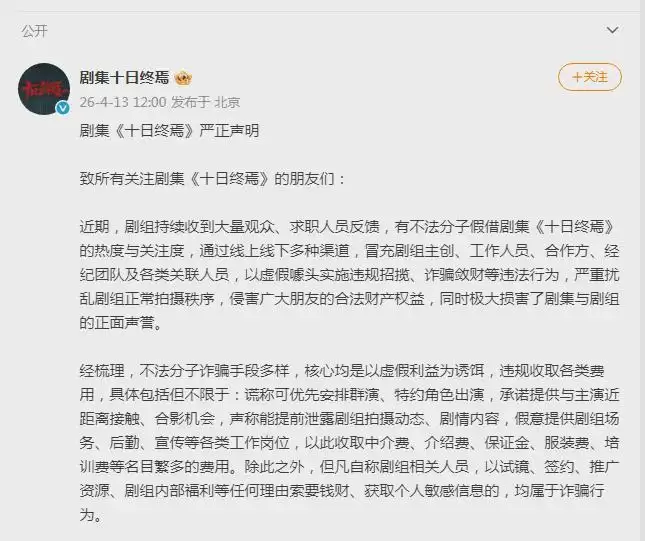 4月13日,备受瞩目的奇幻冒险剧《十日终焉》官方发布了一则严正声明,针对近期社会上出现的多起冒用剧组名义进行的欺诈行为予以强烈谴责和澄清。