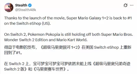 近期,一个有趣的现象在游戏圈引发关注:随着《超级马里奥银河大电影》在全球影院热播,这股席卷而来的怀旧与新潮融合的热浪,迅速反哺至游戏市场。根据知名外网博主@Stealth40k分享的销售数据,《超级马里奥银河1+2合集》已强势登顶美国区Switch eShop销量排行榜,其上升势头可谓异常迅猛。