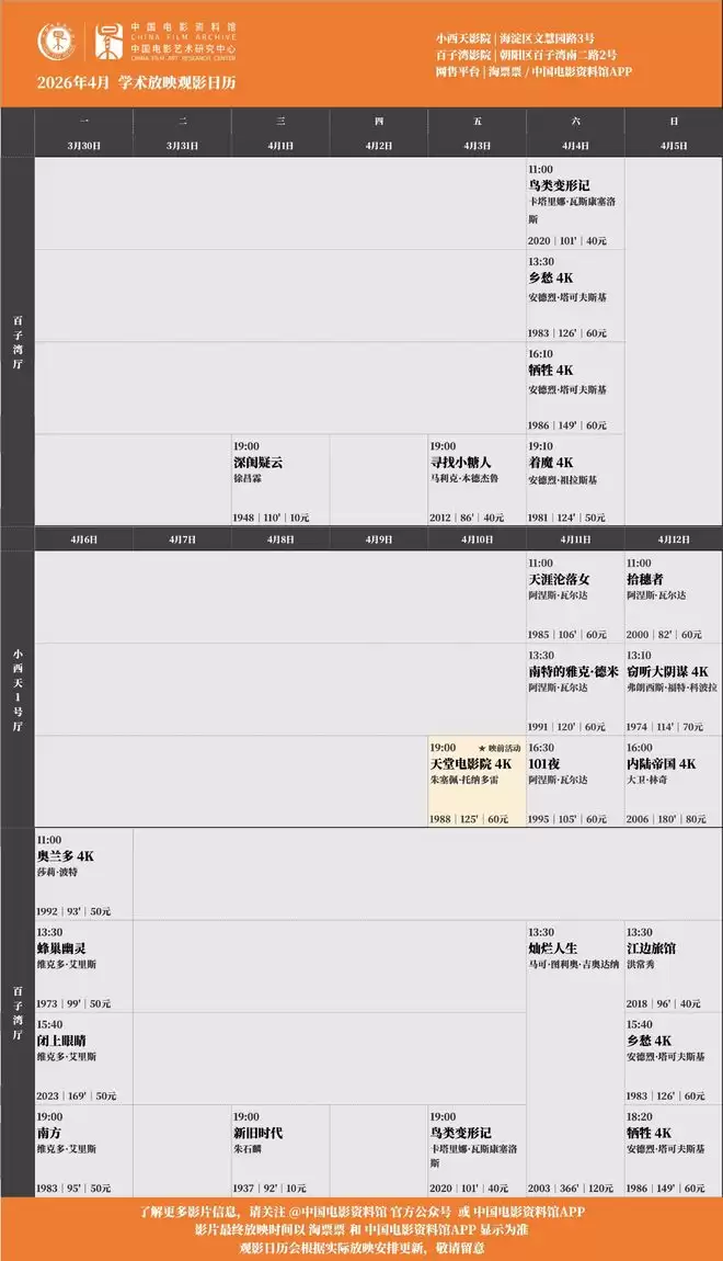 温馨提示:小西天艺术影院今日放映结束后将进入短暂休整期,我们相约4月16日北京国际电影节开幕时再见。此外,百子湾艺术影院在北影节期间将暂停常规放映,预计于五月恢复。