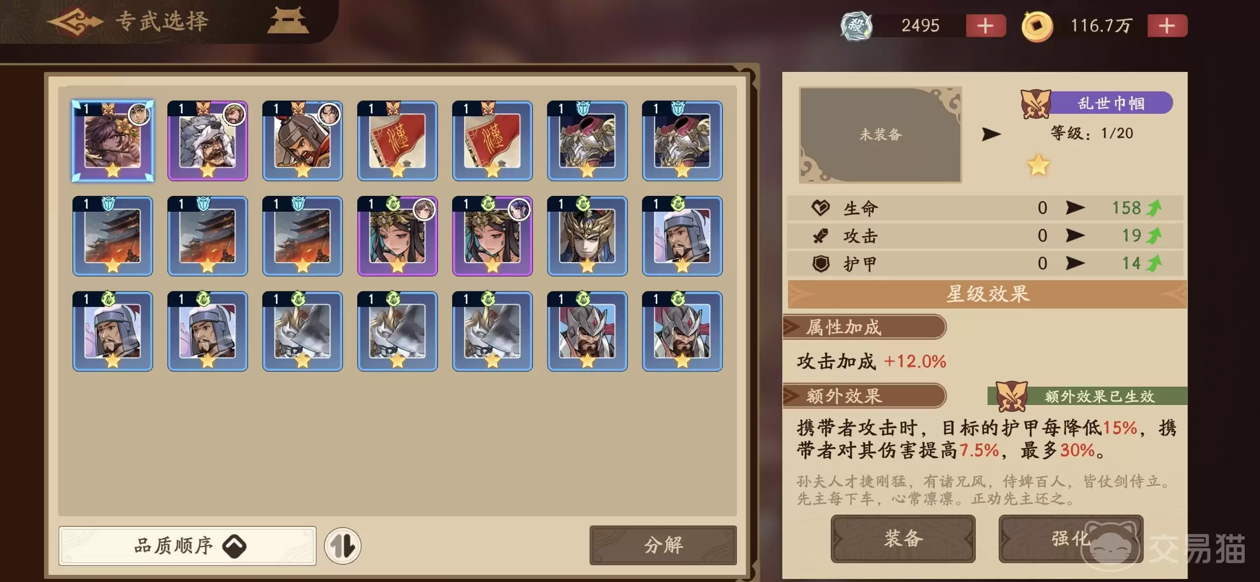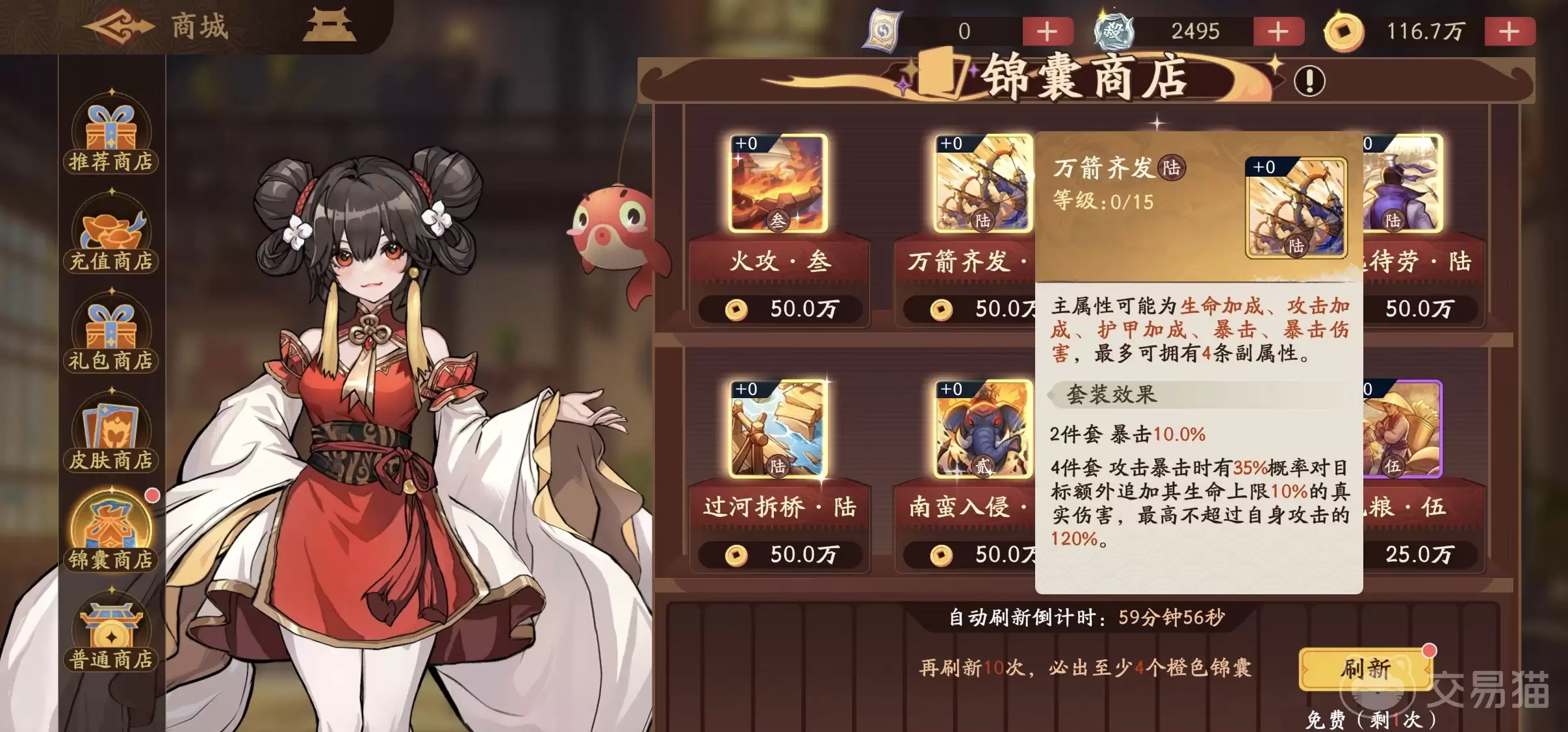 装备方面,专属武器“乱世巾帼”几乎是首选,其降低目标护甲并提升对应伤害的特性,与王朗的技能机制堪称天作之合。锦囊选择上,“万箭齐发”能有效扩大技能覆盖面,提升状态附加的频率。套装效果建议优先考虑两件套提升暴击率、四件套在暴击时追加真实伤害的组合,这能极大放大他的输出收益。