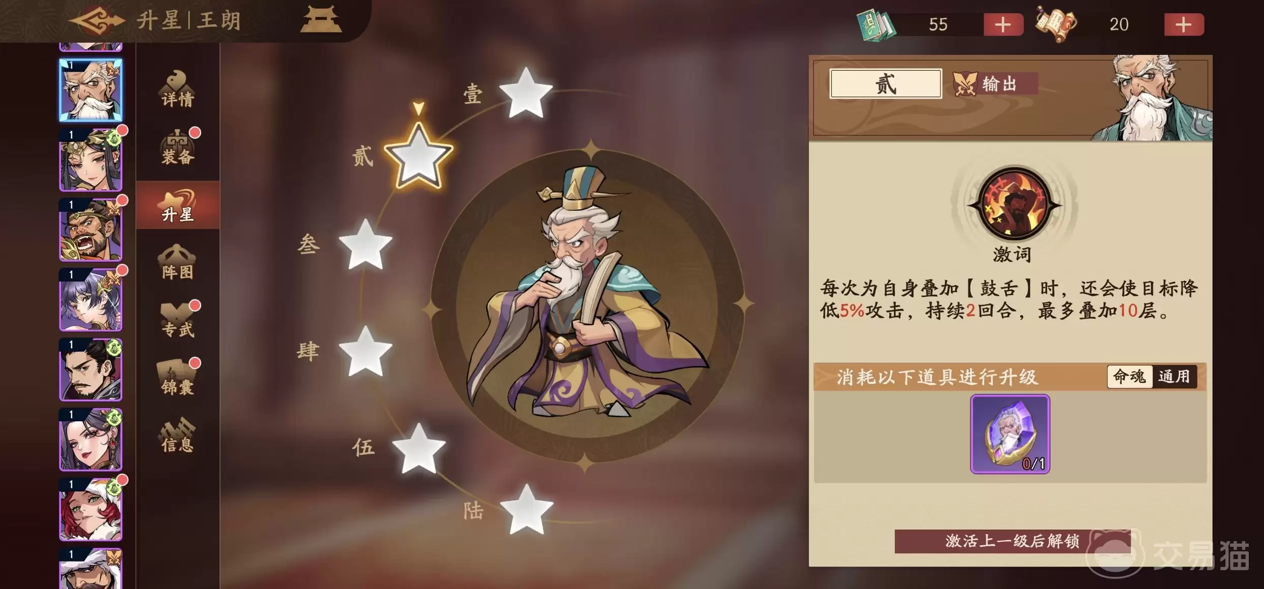 作为紫阶武将,王朗的基础属性自然无法与顶级的橙将、红将相比,但他的技能体系却赋予了他极强的动态成长性。其必杀技会对敌方单体随机目标发动攻击,命中后有概率施加一层“鼓舌”状态。有意思的来了:如果这次没能成功挂上“鼓舌”,那么王朗自己则会获得一层“饶舌”。