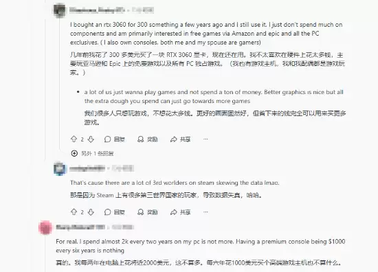 关于PC玩家的真实画像,也有数据派玩家给出了澄清。Steam的硬件调查数据表明,绝大多数玩家并没有使用昂贵的高端显卡,主流中端显卡已足以满足日常游戏需求。对很多人来说,游戏的数量和可玩性远比极致的画面特效更重要。把升级硬件的巨额预算省下来,反而能购入一个庞大的游戏库。