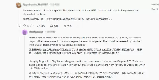 不过,比钱&包更让部分玩家焦虑的,是游戏内容本身。一种普遍的看法是,本世代主机游戏过于依赖重制版和系列续作,创新力显得不足。有网友尖锐指出,索尼将大量资源投入了未见显著成效的在线服务型项目中,如果旗下工作室能更专注于打造高质量的单机体验,如今市面上的原创大作理应更多。以顽皮狗为例,其真正的PS5原生独占作品尚未面世,新作的预计窗口又与PS6的上市节点高度重合,这不禁让人对未来的内容节奏产生疑问。