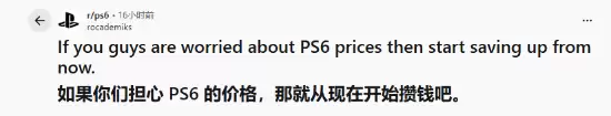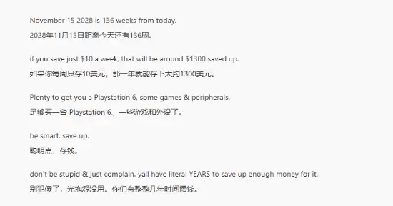 面对可能高达数百甚至上千美元的新主机,有玩家表现得极其务实,直接甩出了一份详细的“存钱路线图”。如果假设PS6在2028年11月发售,那么从现在算起还有足足136周。他们的方案很简单:每周省下10美元,到期就能稳稳攒下超过1300美金。这笔钱不仅够买主机,连带着游戏和额外配件也一并解决了。提议者还不忘提醒大家:与其空抱怨价格高,不如早早开始规划,毕竟好几年的时间,足够从容准备了。