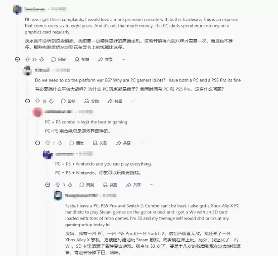讨论自然不可避免地引爆了新一轮的平台之争。主机阵营的玩家认为,一台高性能主机用上六七年才换代,这笔一次性投入远比PC玩家频繁升级显卡要经济。当然,反对搞“平台对立”的声音同样响亮。很多人坦言,自己就是“全平台党”,同时拥有高性能PC和PS5 Pro,体验各有千秋,无需割席。更经典的方案是“PC+PS+Switch”组合,几乎能通吃所有想玩的游戏。