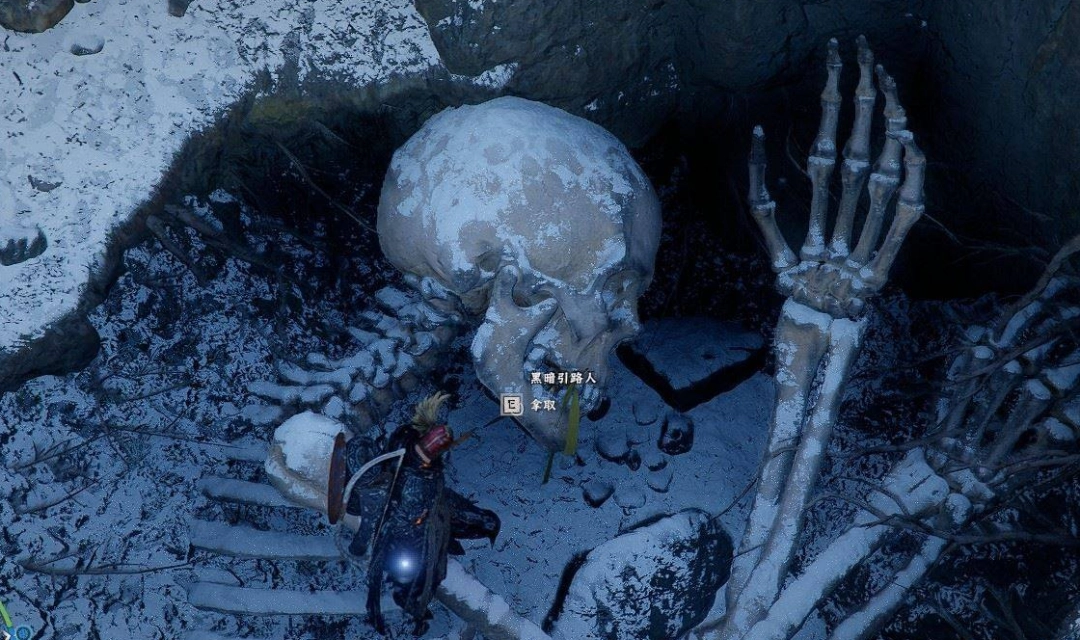 核心位置就在骷髅头部。请直接靠近骷髅的嘴部,并从其口腔内部进行探索,黑暗双手剑即固定刷新于此。这种“巨兽遗骸藏宝”的设计,极大地增强了探索的沉浸感与成就感。