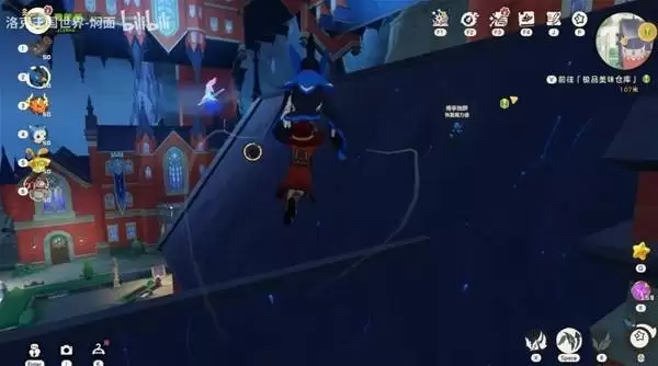 完成右转操作后,继续沿着新方向前进。飞行途中,你会路过一只非常显眼的大型猫咪NPC,这是一个绝佳的路线参照物。之后,当你飞过一栋具有标志性的红房子建筑时,就意味着目的地近在咫尺了。你的目标——极品美味仓库,很快就会出现在你的正前方视野中。
