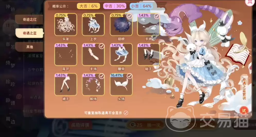 那么,抽卡的概率究竟如何?卡池内的服装按稀有度明确分为三个等级:大吉、中吉、小吉。其中,决定角色核心形象的上衣和发型部件,通常属于“大吉”品质,其掉落概率设定为6%;“中吉”品质覆盖一些重要的装饰组件,概率为30%;而“小吉”则包含了更多常规部件,概率约占64%。这套概率分布是固定的,不会随着卡池主题的轮换而改变。