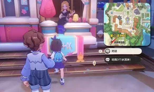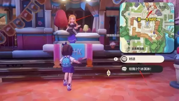 在精灵道具店内,找到名为“脆筒甜甜店”的NPC。与他对话,即可免费领取3个“冰激凌”道具。这是开启后续所有任务的核心物品,务必记得领取。