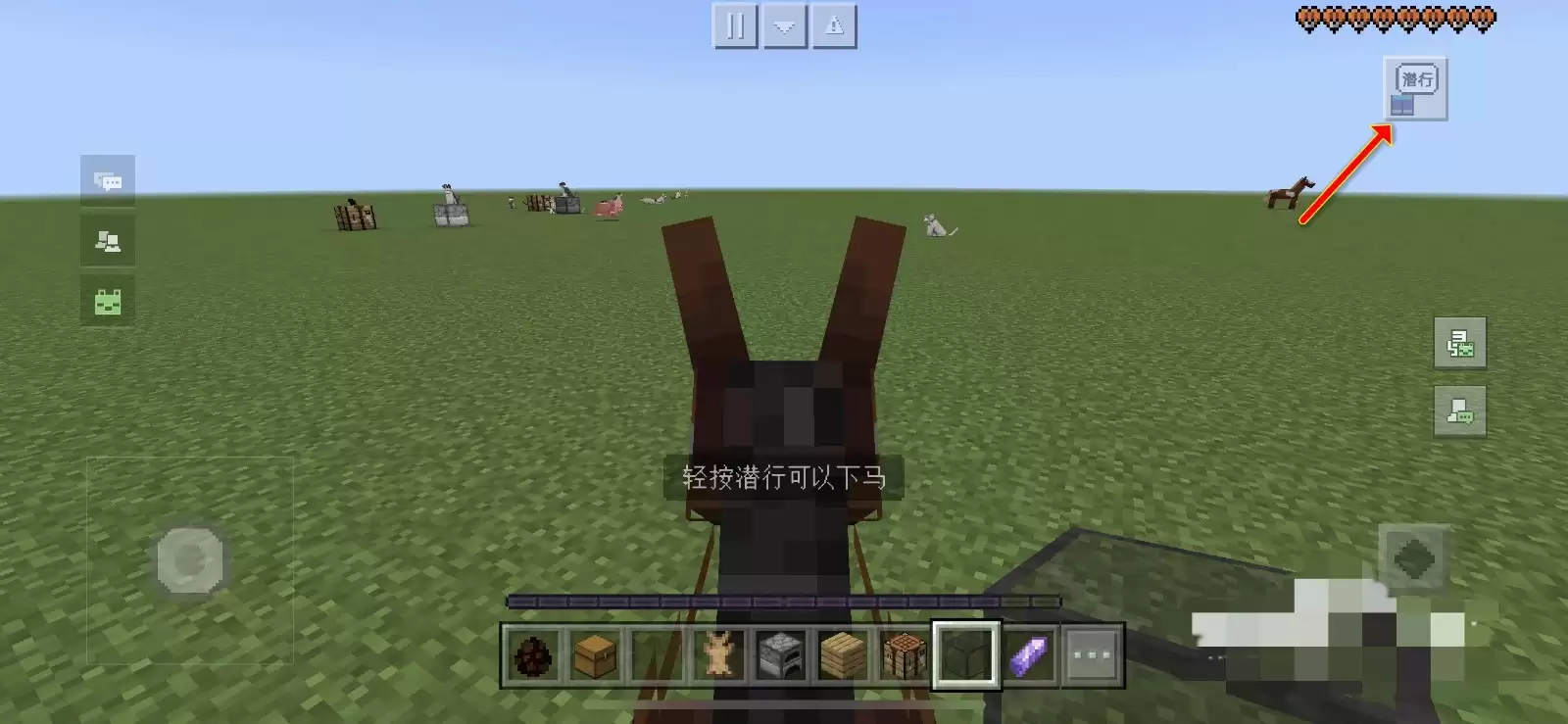 当你顺利骑上骡子后,请将注意力转向屏幕右上角的用户界面。在那里找到并点击【潜行】按键,你的游戏角色便会从骡子背上下来。这个动作是为后续的关键装备步骤做好必要准备。