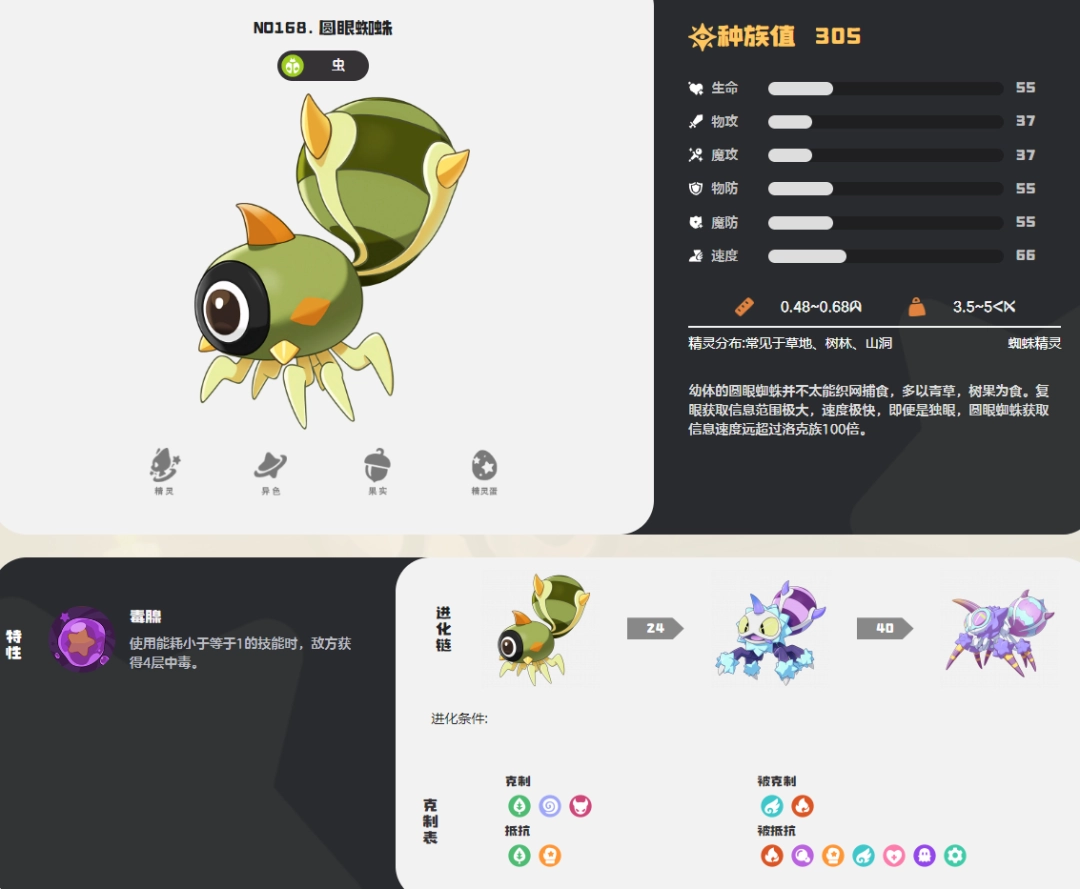 然而,最令人惊叹的莫过于它们那双标志性的复眼。这双眼睛赋予了圆眼蜘蛛极其广阔的信息获取范围,其信息处理速度更是快得惊人。科学研究表明,即便仅使用单只眼睛,圆眼蜘蛛解析视觉信号的速度也远超洛克族——保守估计,至少达到洛克族视觉处理能力的100倍以上。这种与生俱来的天赋,使得圆眼蜘蛛在洛克王国复杂多变的环境中,总能敏锐洞察,抢占先机。