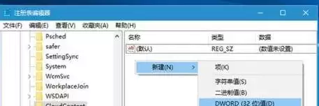 5. 点击选中刚刚新建的“CloudContent”项,在右侧空白处右键,选择“新建” -> “DWORD (32位)值”。这个新值的名称需要设置为 DisableWindowsConsumerFeatures,如下图所示。