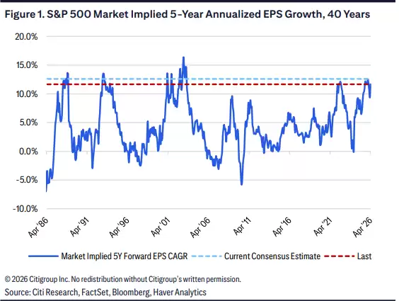 据追风交易台,花旗美股策略师Scott Chronert团队在最新报告中指出:现在不是发出卖出信号的时候,但“基本面的举证责任”已经大幅上升。通过反向DCF测算,美股当前指数隐含的五年期EPS年化增速为+11.7%,而自指而上的分析师一致预期是+12.6%,两者之间几乎没有任何误差空间。