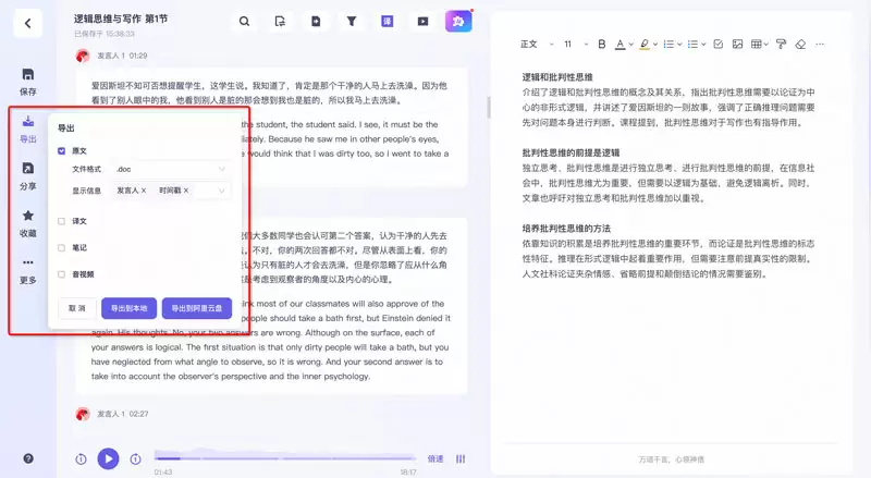 成果的最终输出同样灵活多变。你可以根据需求,选择导出原文、笔记、甚至音视频和译文内容,并支持多项批量操作。在文档格式上,原文和译文均提供Word、PDF及SRT字幕文件等多种选择,充分满足不同场景下的使用需求。