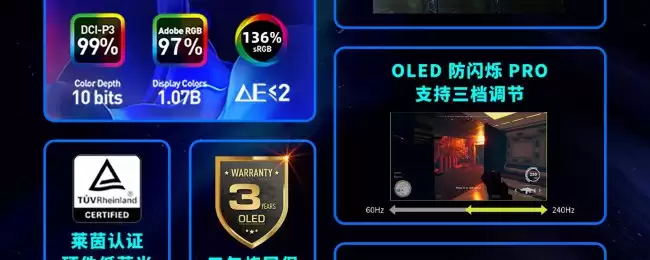 接口配置算是给得相当齐全:提供了两个满血带宽的HDMI 2.1接口、一个DP1.4a接口以及一个Type-C接口,方便连接各种设备。最后,对于用户可能关心的OLED屏幕烧屏问题,微星直接提供了三年的烧屏保修服务,这无疑给消费者吃了一颗定心丸。