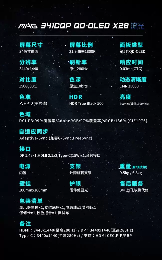 微星推出 34 英寸准 4K 280Hz 带鱼屏显示器流光 X28:第五代 QD-OLED 面板 6499 元