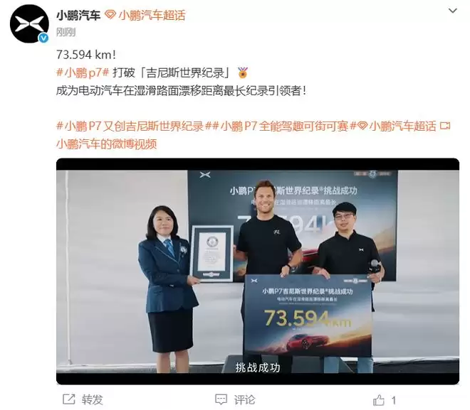 小鹏 P7 打破吉尼斯世界纪录,湿滑路面最长漂移达73.594km