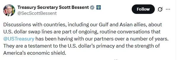 美国财政部长贝森特公开为美元互换额度安排背书,并将其定性为维护美元霸权的战略工具,而非对富裕海湾国家的单纯救助。