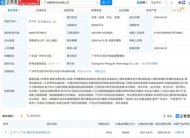 企查查APP显示,近日,广州鹏研科技有限公司成立,注册资本6亿元,经营范围包含:智能机器人的研发;服务消费机器人制造;可穿戴智能设备制造;虚拟现实设备制造等。企查查股权穿透显示,该公司由广州小鹏汽车科技有限公司全资持股。