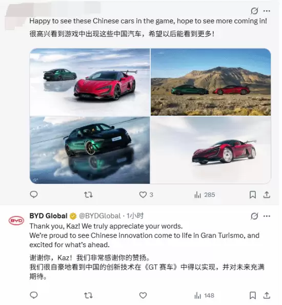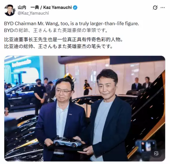 2026年4月27日,《GT赛车》系列制作人山内一典在社交平台X上发布了一条动态,瞬间点燃了全球汽车与游戏圈。动态的主角,是比亚迪股份有限公司董事长兼总裁王传福。山内一典的配文简洁有力:“比亚迪的统帅,王传福先生也是不折不扣的英雄豪杰。”