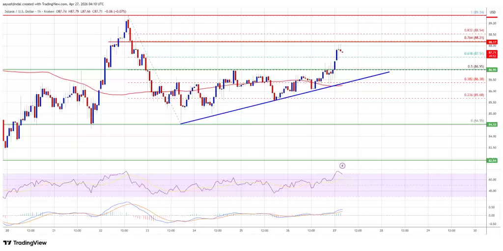 Solana股价在86美元上方开始新一轮上涨。目前SOL价格在87美元上方盘整,并可能进一步冲击90美元上方。