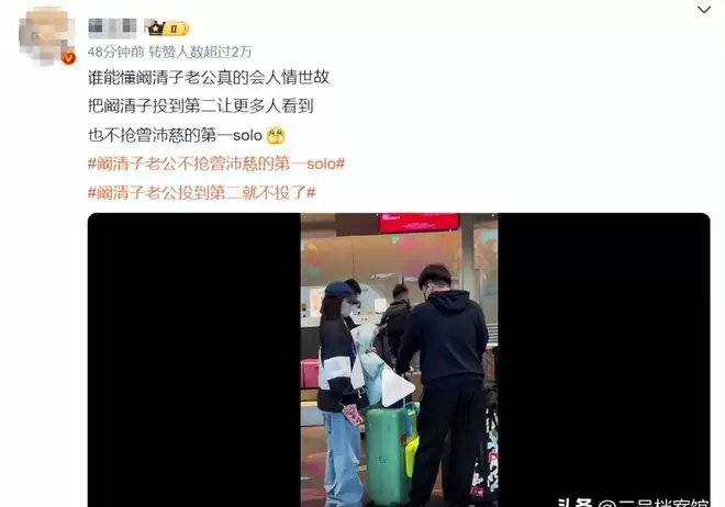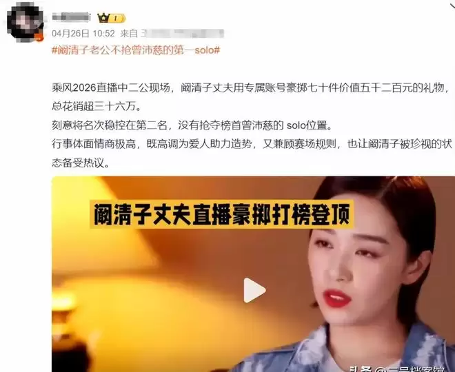 阚清子老公狂砸36万打榜,给她冲到第二就停手,引发三方不同观点