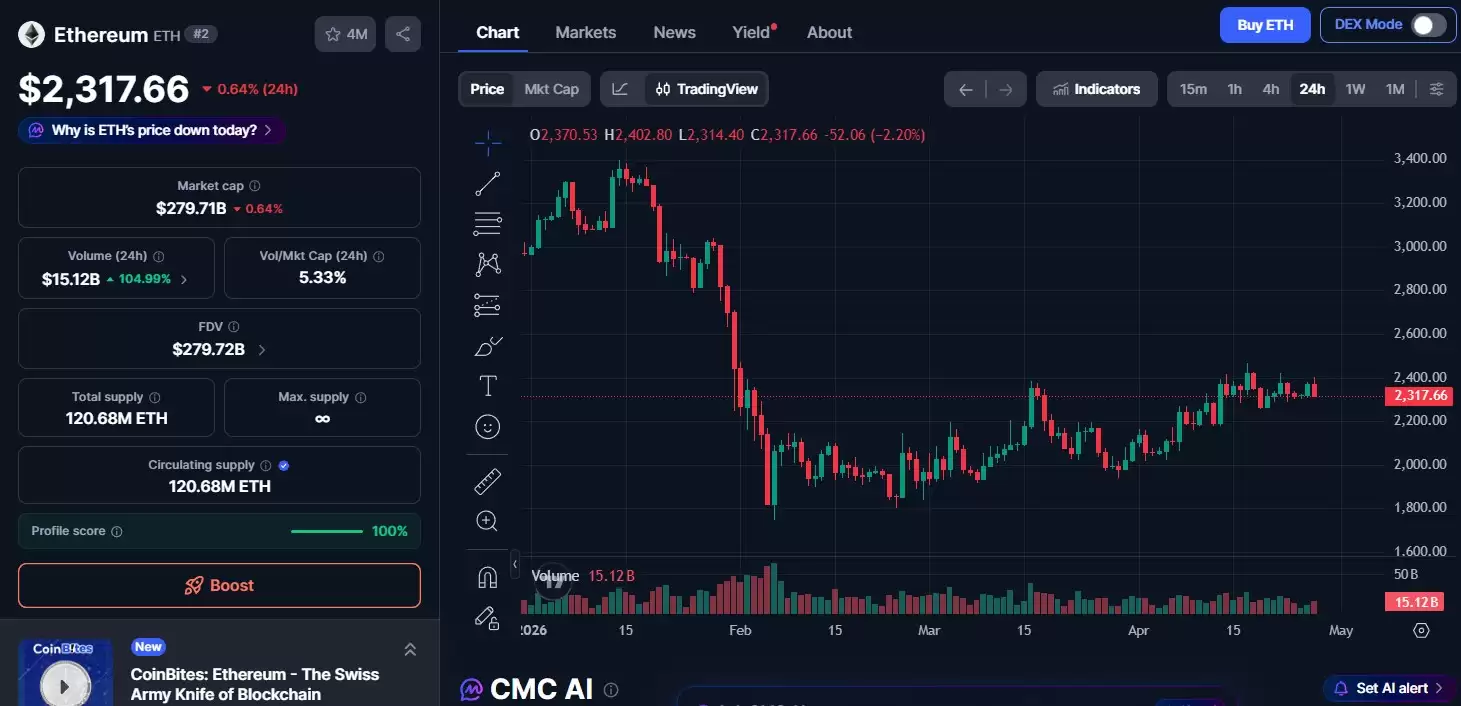 截至当前,以太坊价格在24小时内微跌0.64%,交易在2317美元附近。其市值约为2797.1亿美元,日成交量接近151.2亿美元。价格在2000美元至2400美元这个区间内震荡,清晰地反映出买卖双方力量的暂时均衡。由于整个加密货币市场的整体动能趋于稳定,交易者普遍保持着观望态度。