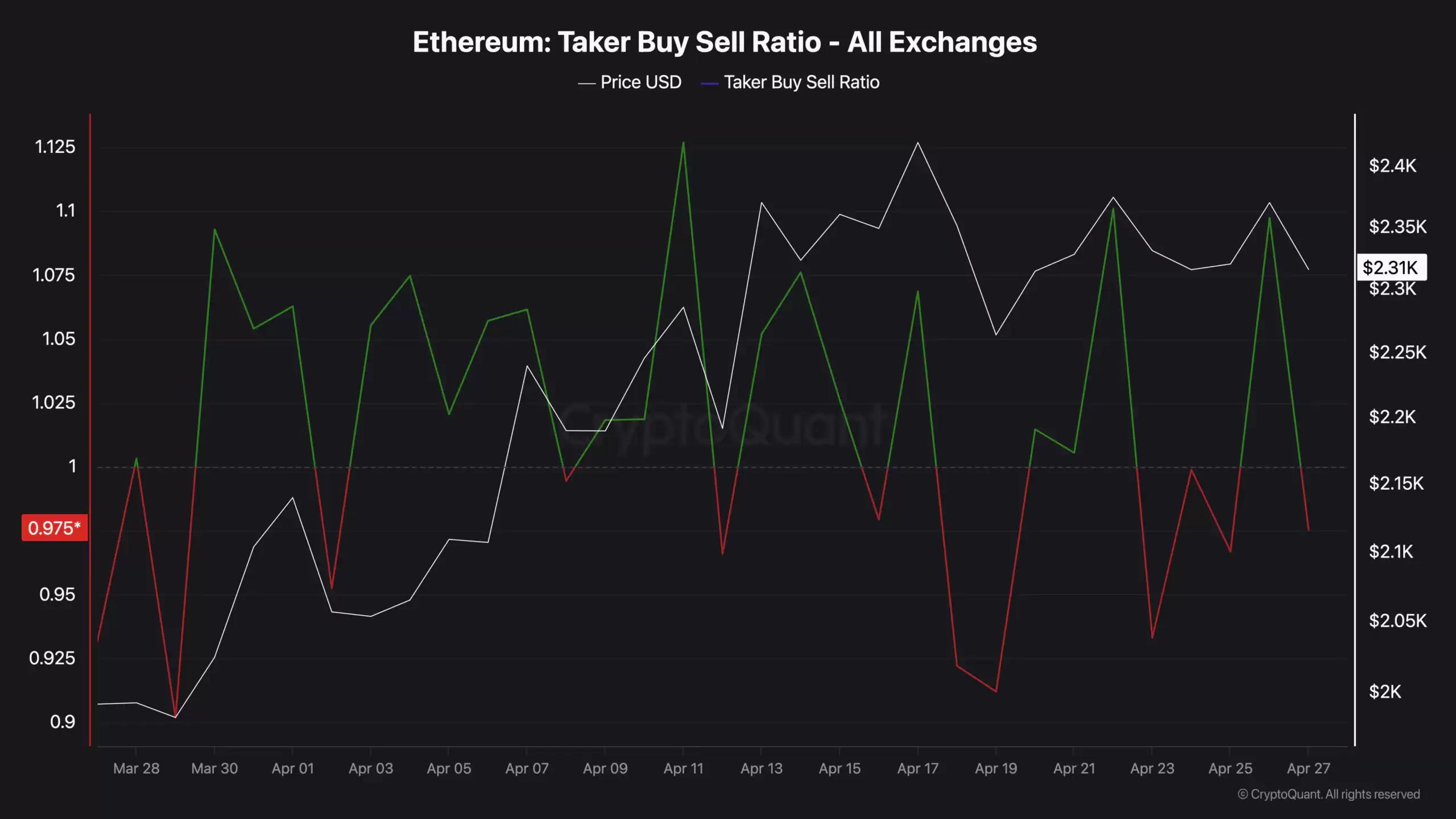 来自CryptoQuant的吃单率数据为此提供了进一步的佐证。0.975的比率表明卖方在衍生品交易流中仅略占上风。然而,比当前读数更具参考价值的,是过去一个月该比率的走势图。