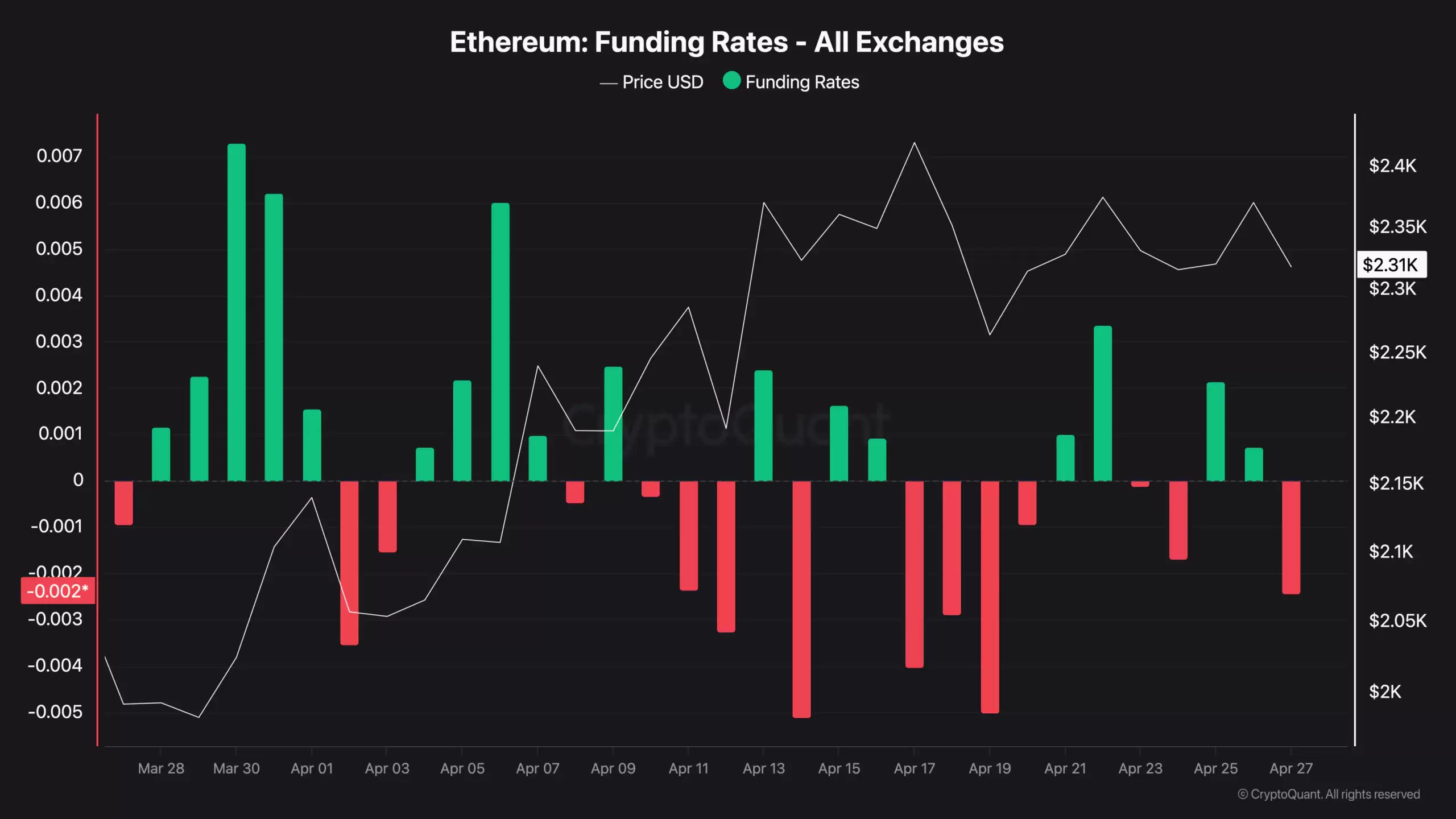 截至4月27日,以太坊在全交易所的资金费率已降至-0.002,并且趋势仍在向下。当资金费率为负时,市场动态就发生了翻转:原本需要付费维持头寸的空头,现在反而需要向多头支付费用。这种碘伏常态的成本结构持续越久,持有空头头寸的成本就越高,其结果自然会抑制新的空头开仓,并最终可能迫使空头回补。