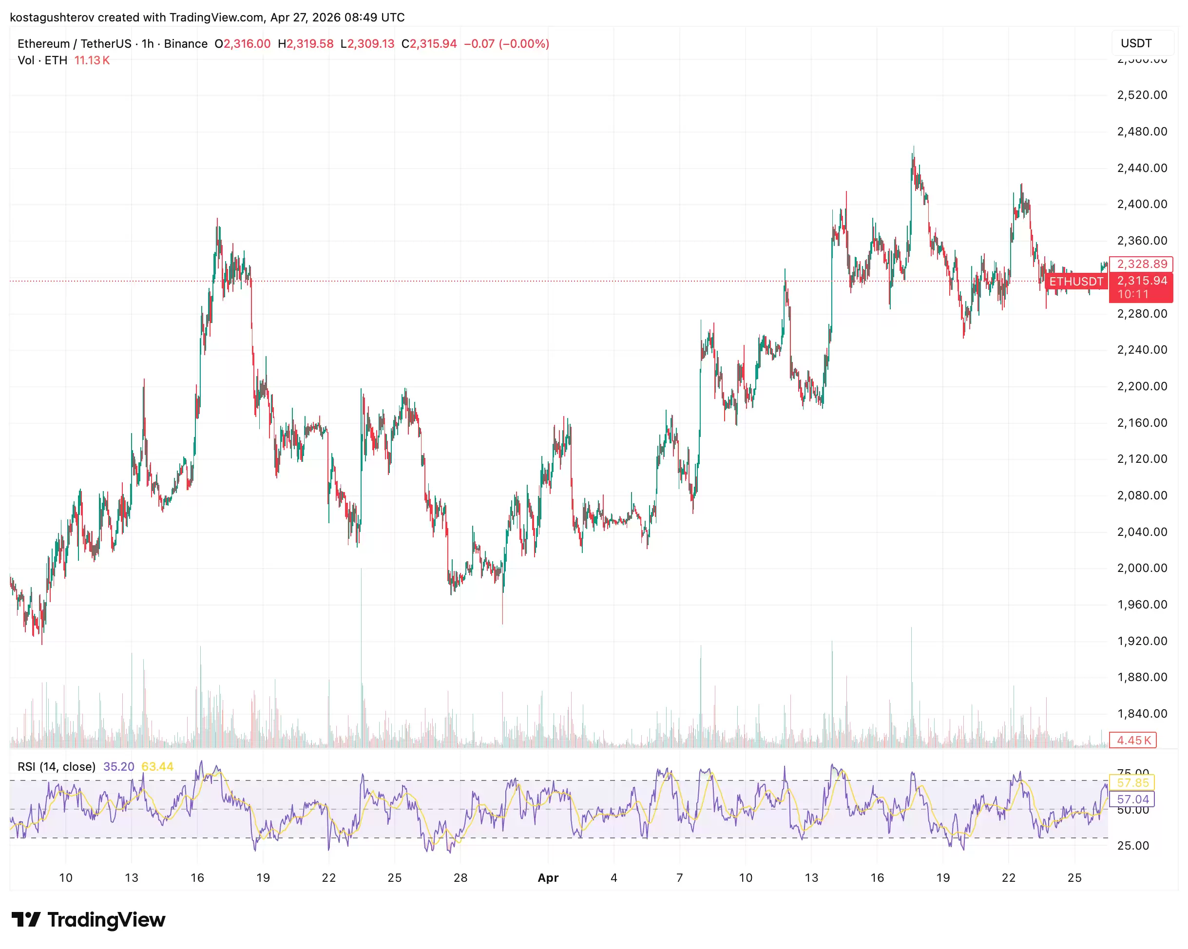以太坊在3月中旬于1950美元附近寻得底部,而4月份的回调低点已抬高至2100美元左右,形成了一个更高的低点。目前,价格在2280美元至2315美元之间构筑了一个稳固的盘整区间。六周内,连续三个更高的低点已经出现。与此同时,相对强弱指数(RSI)读数为35.20,接近超卖区域,但价格却牢牢守在明确的支撑位之上——这与3月和4月低点反弹前的形态如出一辙。历史经验表明,每当以太坊价格在创出更高低点并接近超卖时,抛售压力往往会在突破前耗尽。