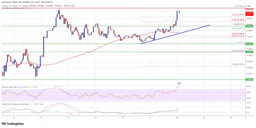 比特币价格开启新一轮上涨,突破了 78,500 美元关口。目前比特币正在盘整,或将冲击 79,200 美元上方。
