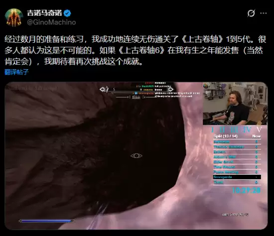 然而,征服了交界地并未让他停下脚步。最近,这位“自虐式”挑战大师将目光投向了历史更为悠久的经典系列。在一场长达11个多小时的YouTube直播马拉松中,他完成了从初代《上古卷轴:竞技场》到《上古卷轴5:天际》全系列主线剧情的无伤通关挑战。这听起来如同天方夜谭,但他却用实实在在的操作证明了其可行性。