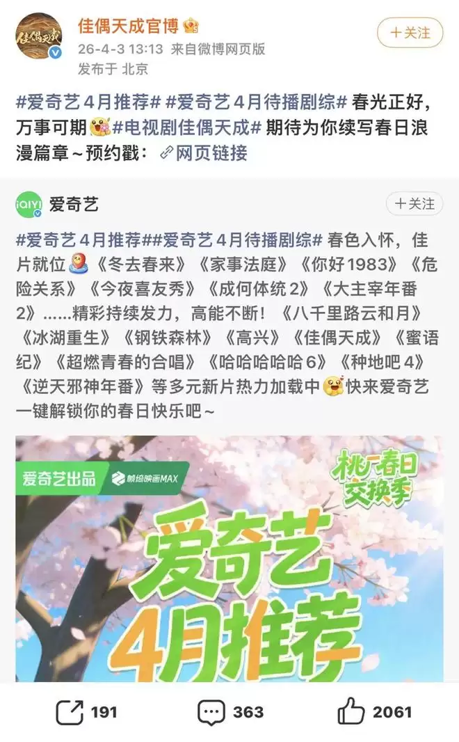 这似乎意味着,爱奇艺虽将《佳偶天成》分销给腾讯视频,却依旧牢牢掌握着宣发主导权与平台主体性。双方看似联播,实则仍在流量与话语权上暗自较劲。