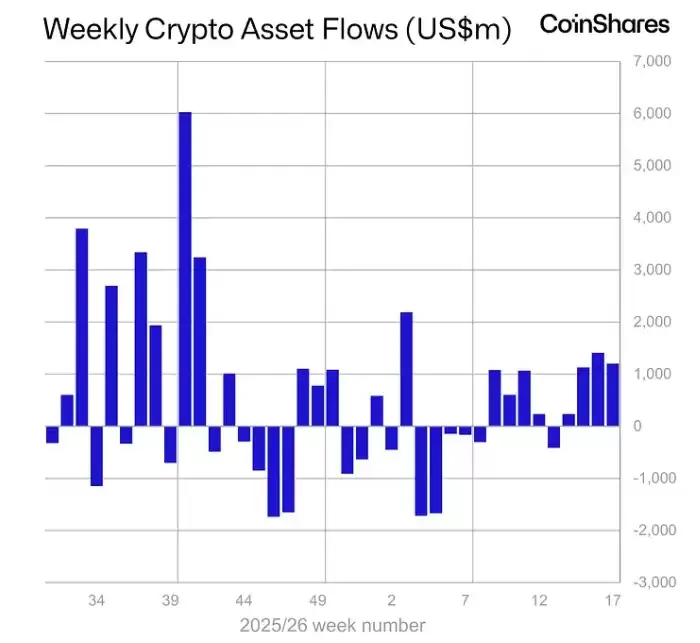 市场情绪正在悄然转变。最近一周,数字资产投资领域传来一个明确的信号:机构资金正以稳健的步伐回归。根据CoinShares的数据,加密货币交易所交易产品(ETP)在上周吸引了高达12亿美元的资金流入。这已经是连续第四周资金净流入,累计规模接近39亿美元。可以说,这是今年以来最强劲的一波“吸金”潮,清晰表明在经历了2026年初的观望期后,投资者正重新、且更为坚定地布局加密资产。