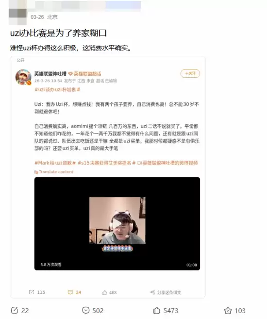 那么,支撑这种高消费生活的底气从何而来?这就不得不提到他背后的商业版图了。据一些吧友分享,Uzi本人在直播中曾透露,前段时间火爆电竞圈的《英雄联盟》Uzi杯,其举办初衷之一就是“想赚点钱”。这个说法,倒是和不少博主的分析对上了。有分析就指出,Uzi的家庭消费水平确实非同一般,动辄数百万的开销是家常便饭,朋友聚会也常常是他来买单。这背后,无疑是他作为顶级电竞IP强大的商业变&现能力在支撑。
