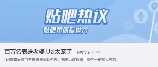 果不其然,相关讨论很快发酵。看看数据就知道有多火:截至发稿前,贴吧里“百万名表送老婆,Uzi太宠了”这个话题,实时讨论量已经冲到了46.8万。这关注度,确实配得上他“永远滴神”的称号。