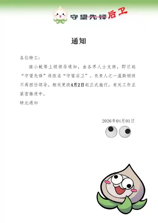 接小鱿等上级领导通知,经各界人士支持,即日起“守望先锋”将正式改名“守望后卫”。负责人之一温斯顿将不再担任领导职务。相关改动自4月2日起生效,目前各项工作正紧密推进中。