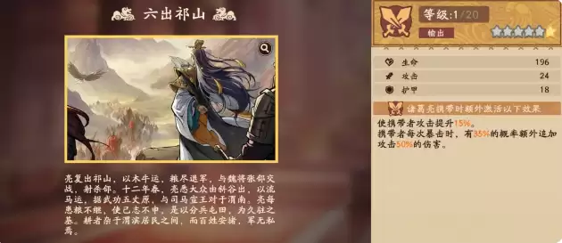 在为他搭配“溯影”(专属武器或装备)时,首选推荐“六出祁山”。这件溯影的强大之处在于,即使诸葛亮没有满命,它也能提供更高的追击伤害。对于资源有限、无法快速将诸葛亮升到六星的玩家来说,“六出祁山”几乎是必备品,它能弥补星级不足带来的伤害缺口。